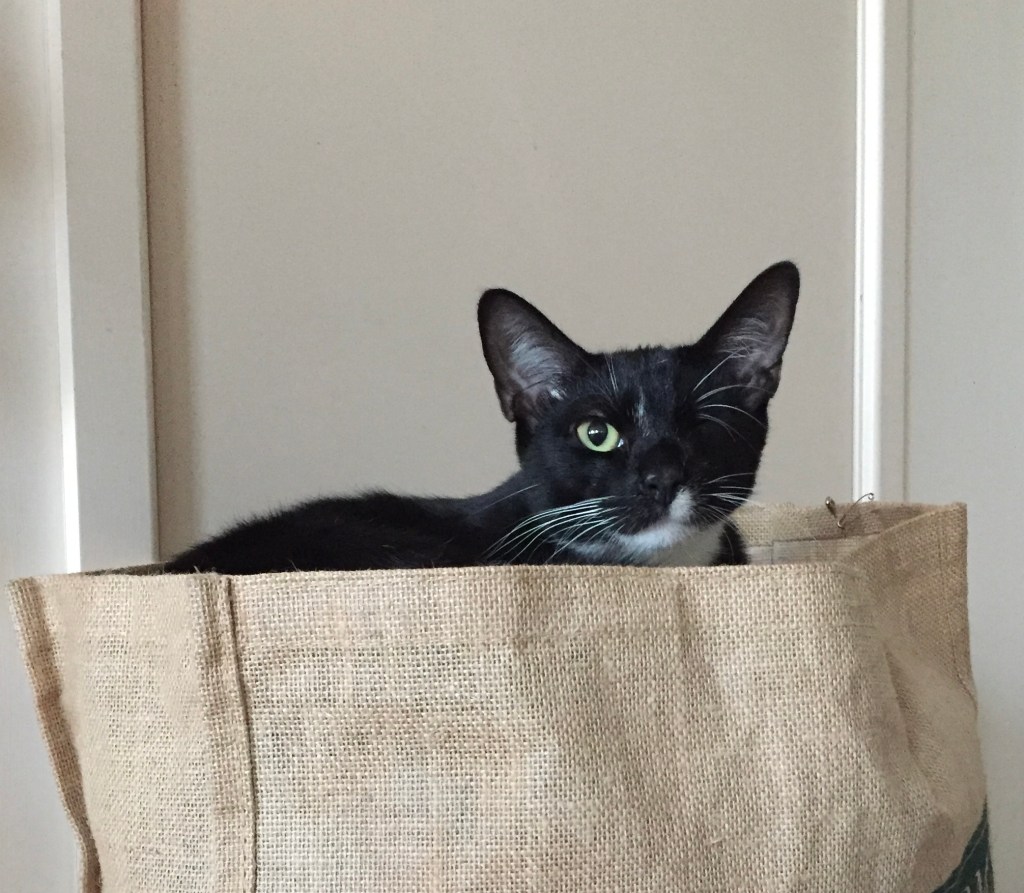 この写真では、戦士がしっかりとショッピングバッグの中に収まって、まるで自分の特等席を見つけたかのように満足そうな表情をしています。彼は狭い場所や囲まれた空間が大好きで、今回もこのバッグを見つけると、すぐにその中に入ってしまいました。