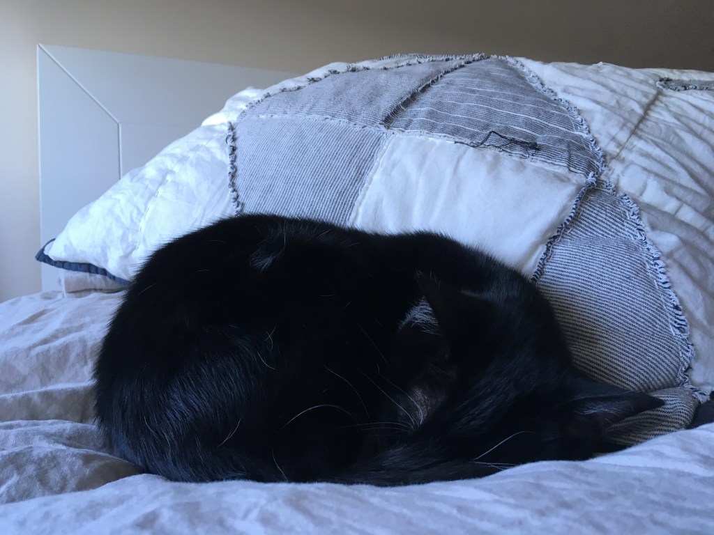 戦士は寒い日やリラックスしたい時に、こうして自分をまるでボールのように丸めてお昼寝するのが大好きです。彼の黒い毛が光を吸収して、まるで黒い宝石のように輝いていますね。この姿勢は、彼がどれだけリラックスしているか、そしてどれほど安心して過ごしているかを物語っています。