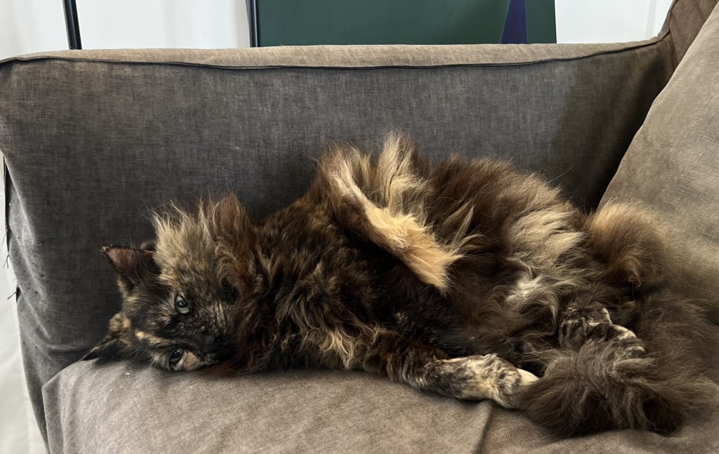 サクラは、陽の光が大好きで、こんな風にぽかぽかとした日差しの中でくつろぐ時間が何よりの楽しみです。彼女のふわふわの毛が光を受けて輝き、その姿はまさに幸せそのものです。