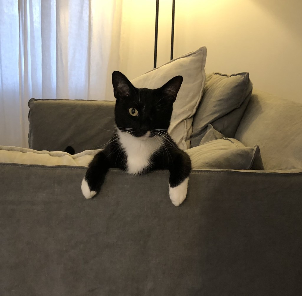 ソファの肘掛けにちょこんと乗せられた前足が、このポーズの可愛さをさらに引き立てています。戦士はこの場所で、きっと何か楽しいことを考えているのでしょう。