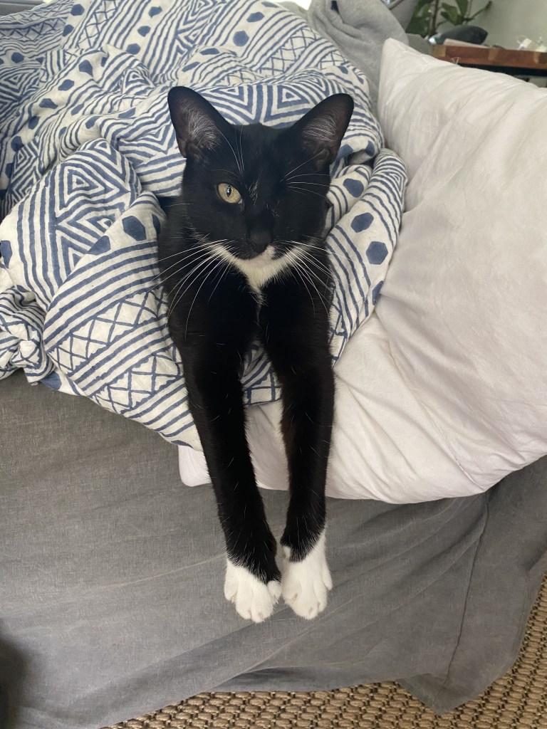 今日は、戦士が見せてくれたとてもリラックスした瞬間をシェアします。この写真では、戦士がベッドの端にだらーんと足を垂らしながら、まるで世界で一番快適な場所を見つけたかのようにくつろいでいます。